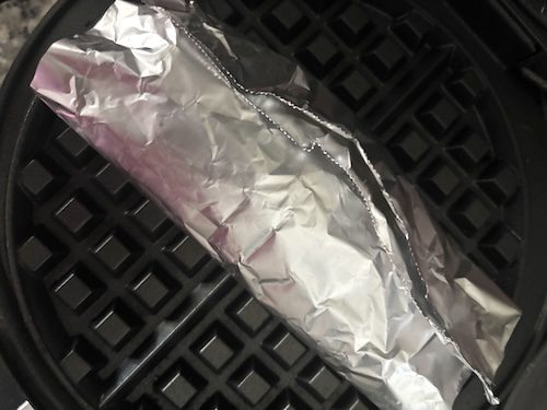 Shape the cannoli shell while still hot (for best results): turn off waffle iron. While still hot, with a safe kitchen glove in hand, roll up the hot cannoli shell (like a burrito) in the one piece of aluminum foil it's sticking to. Let cool completely.