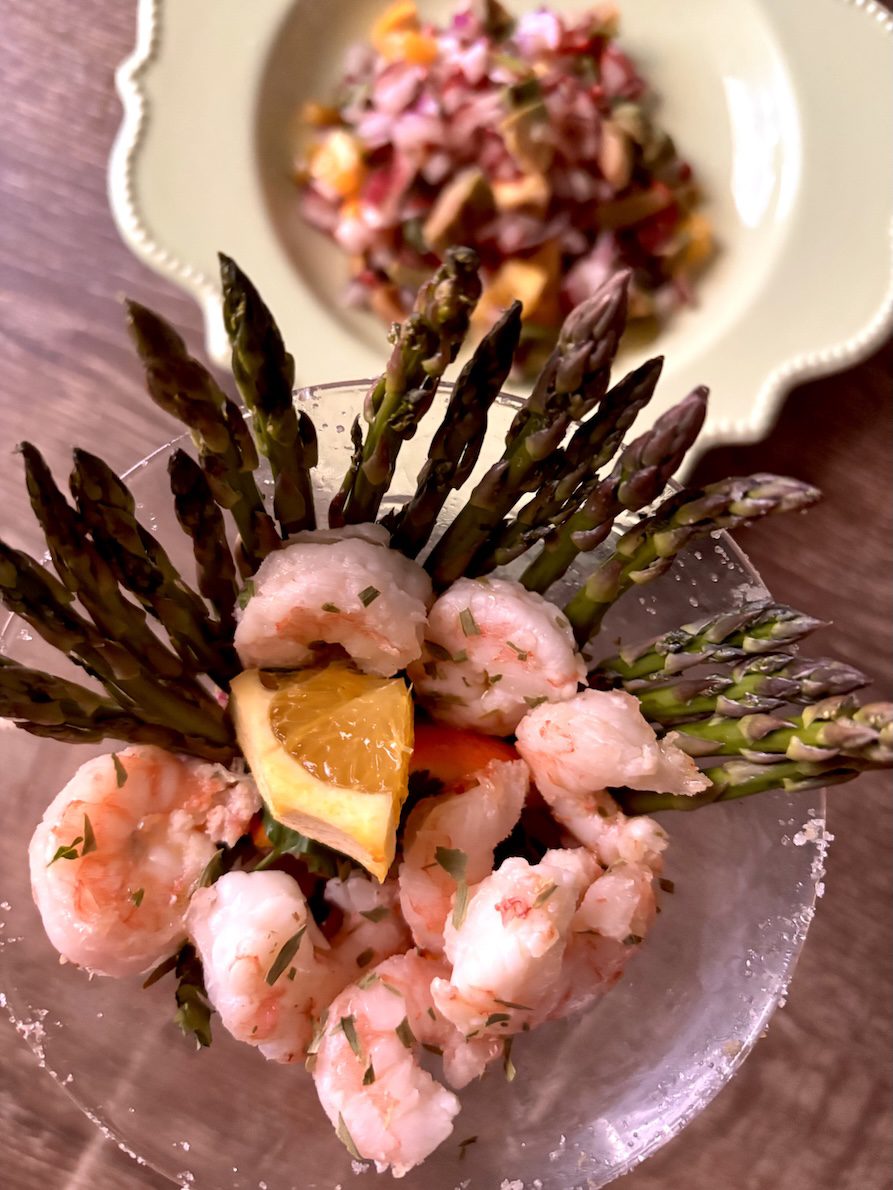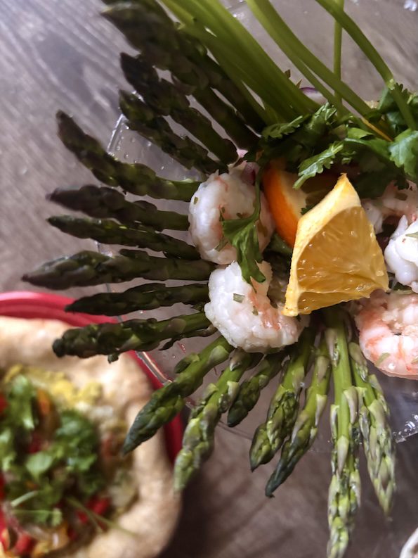 To reel in the ocean-y ceviche appetizer to green land, I added asparagus spears and cilantro stalks. It’s now a salad.