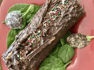 - Pour melted chocolate over the cake and after cooled, drag a fork around the glaze for a yule-log effect.