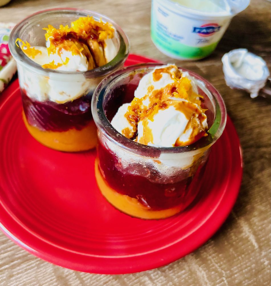 - Layer pumpkin, cranberry, and yogurt. Zhugh with orange zest.