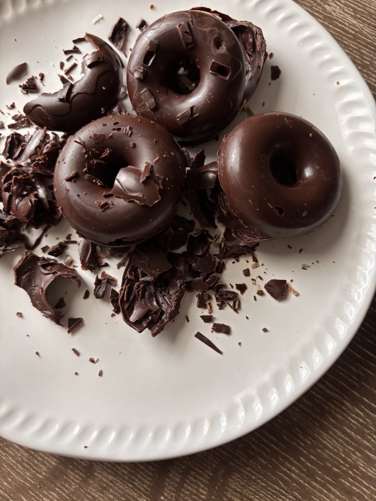The fun part is tempering dark chocolate from dark chocolate morsels or baking squares. And it’s worth the small extra effort, as you get this nice shiny finish no matter what shape your donuts are.