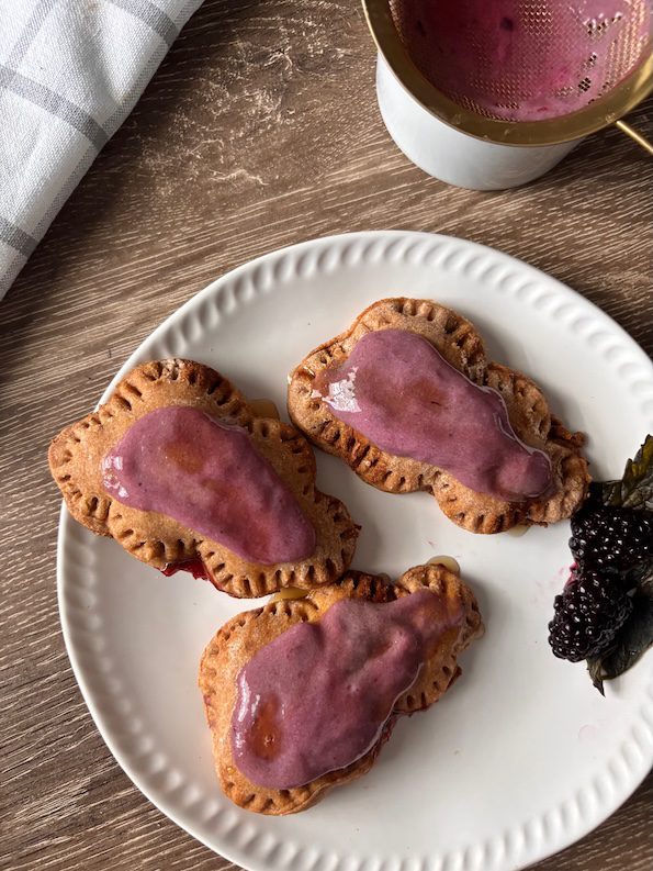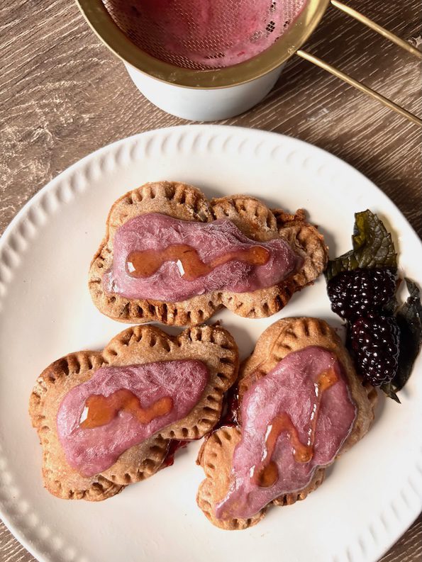 • For the glaze: crush berries and add milk, maple syrup, and water or liquid like lime juice until you get the right glaze consistency. Tip: push the glaze through a filtered sieve. If it's too thick, it won't go through.