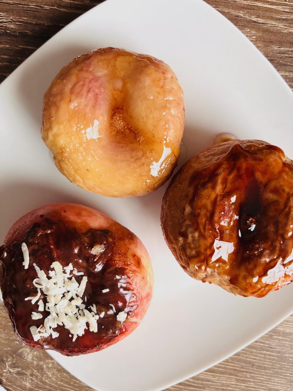 If you skip this part and only bake them, the skin on the peach donuts will dry out some and they will be darker in color because the peach naturally starts off darker in color.