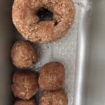 - Roll 8 balls with hands and add to baking sheet pan (or make 2 donut rings and 4-5 1" balls).