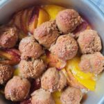 Then use a scooper or spoon out scoops onto peaches. Since they’re cobblestone shaped, they don’t have to be exactly all the same size or shapes. Oblong or round will work!