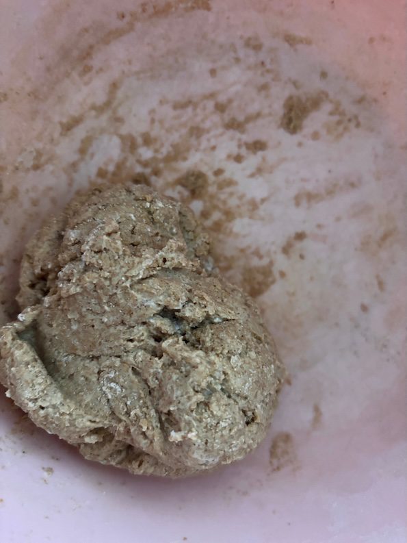 - Combine wet ingredients to dry ingredients with a spoon or whisk, and add the salt. This will be a sticky wet dough that's easy to make a dough ball.