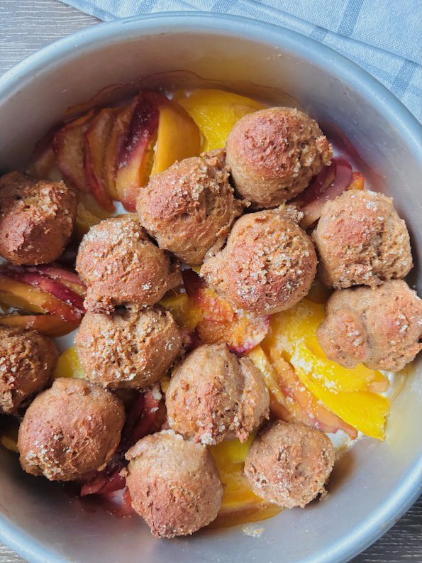 Then use a scooper or spoon out scoops onto peaches. Since they’re cobblestone shaped, they don’t have to be exactly all the same size or shapes. Oblong or round will work!