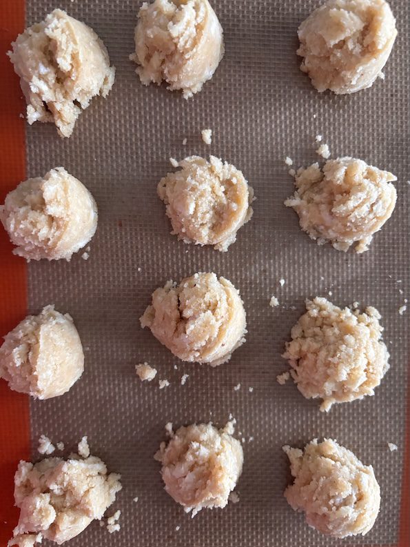 - Scoop small ball with a mini ice cream scooper or use a tablespoon and roll into a ball with a flattened bottom. Place on cookie or baking sheet with silicone Silpat or use baking spray.