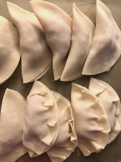 …with thicker dumplings wrappers, I could also simply use water to seal them into half-moon shapes with the same amount of filling.